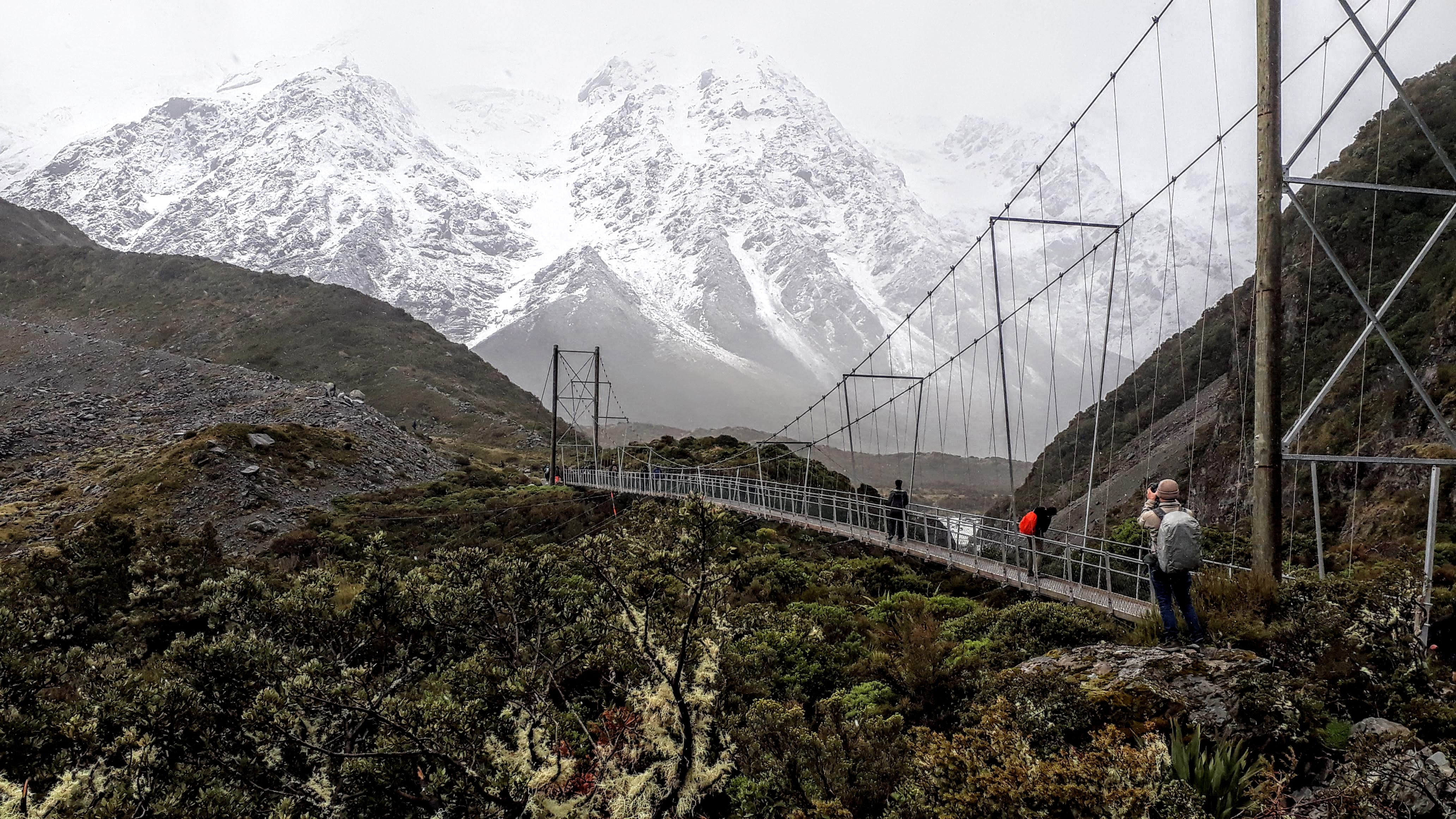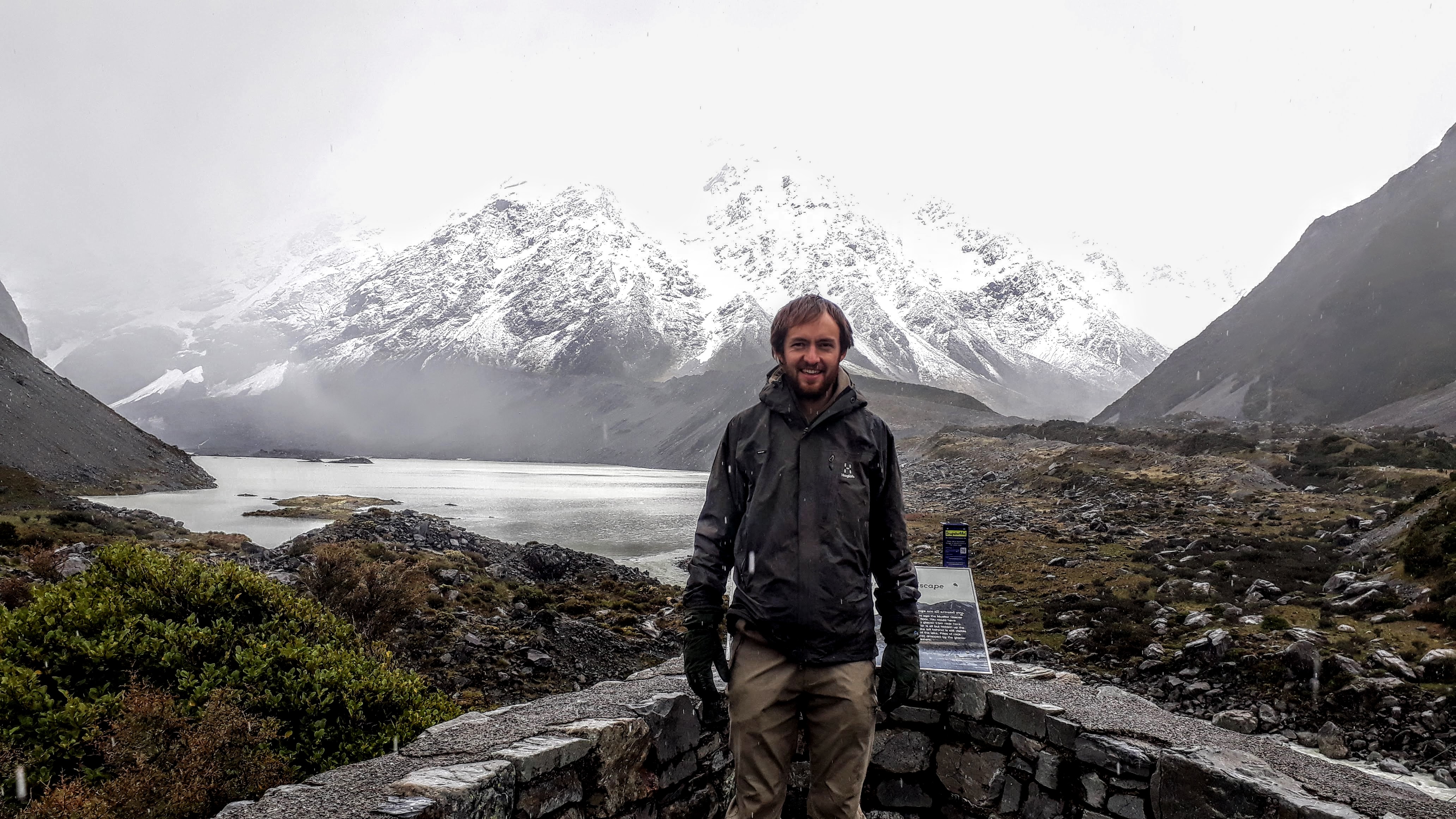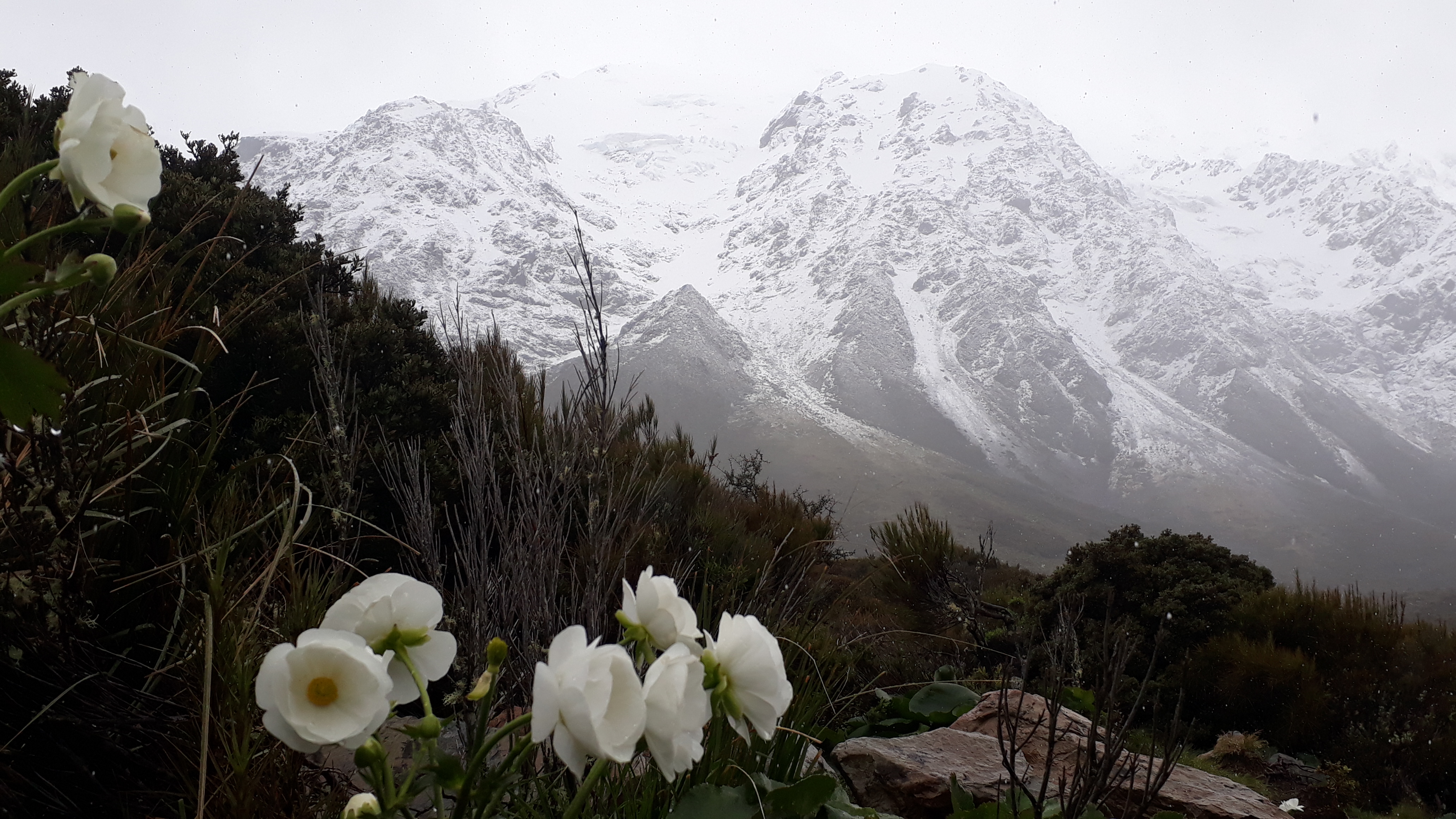 Unfortunately, up this end of the lake the weather was less accommodating and rain and cloud meant that we weren’t able to see much further than the lower slopes from the glacial lake at the end of the valley. We did enjoy the snowy surroundings though, as well as being able to spot some Mount Cook Lilies at the side of the path.